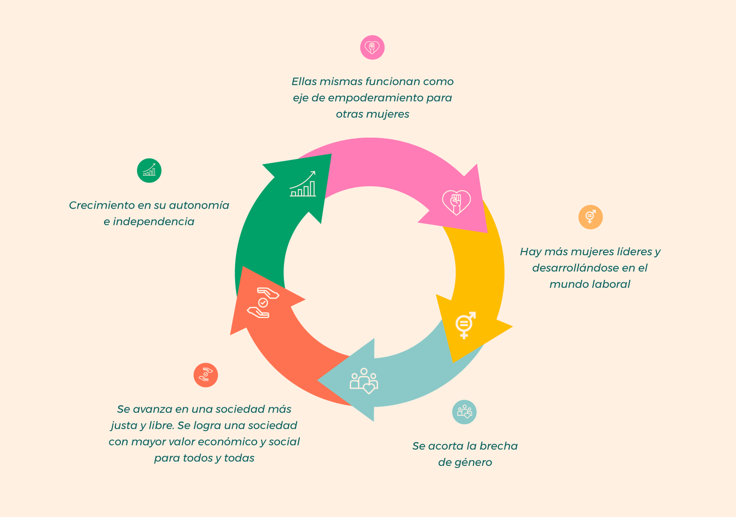 Creemos que el empoderamiento femenino es un motor de cambio muy relevante para generar los cambios que necesitamos en materia de igualdad de género. Por eso desarrollamos este modelo que explica la importancia de trabajar el empoderamiento a nivel personal, mutuo y social